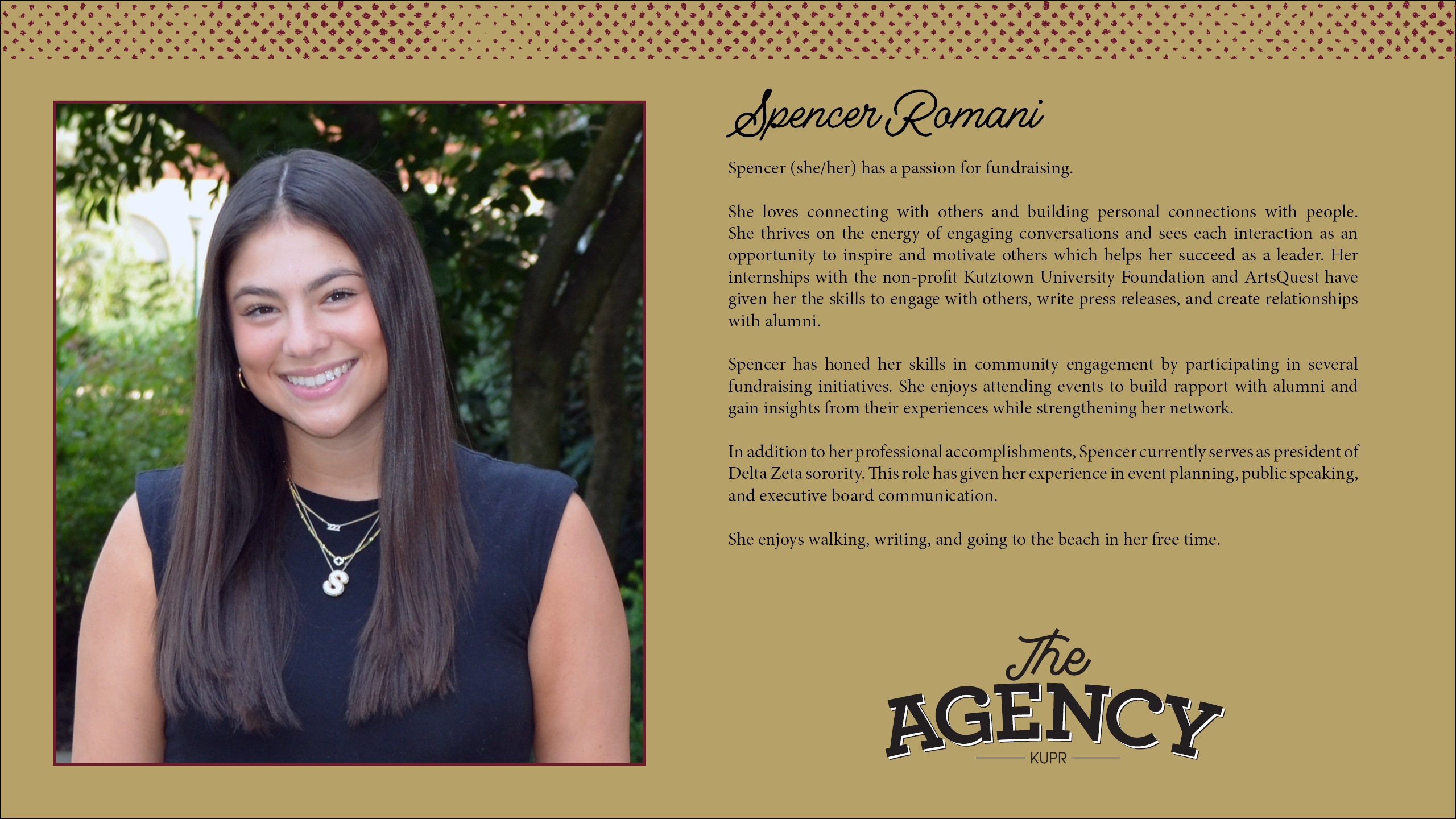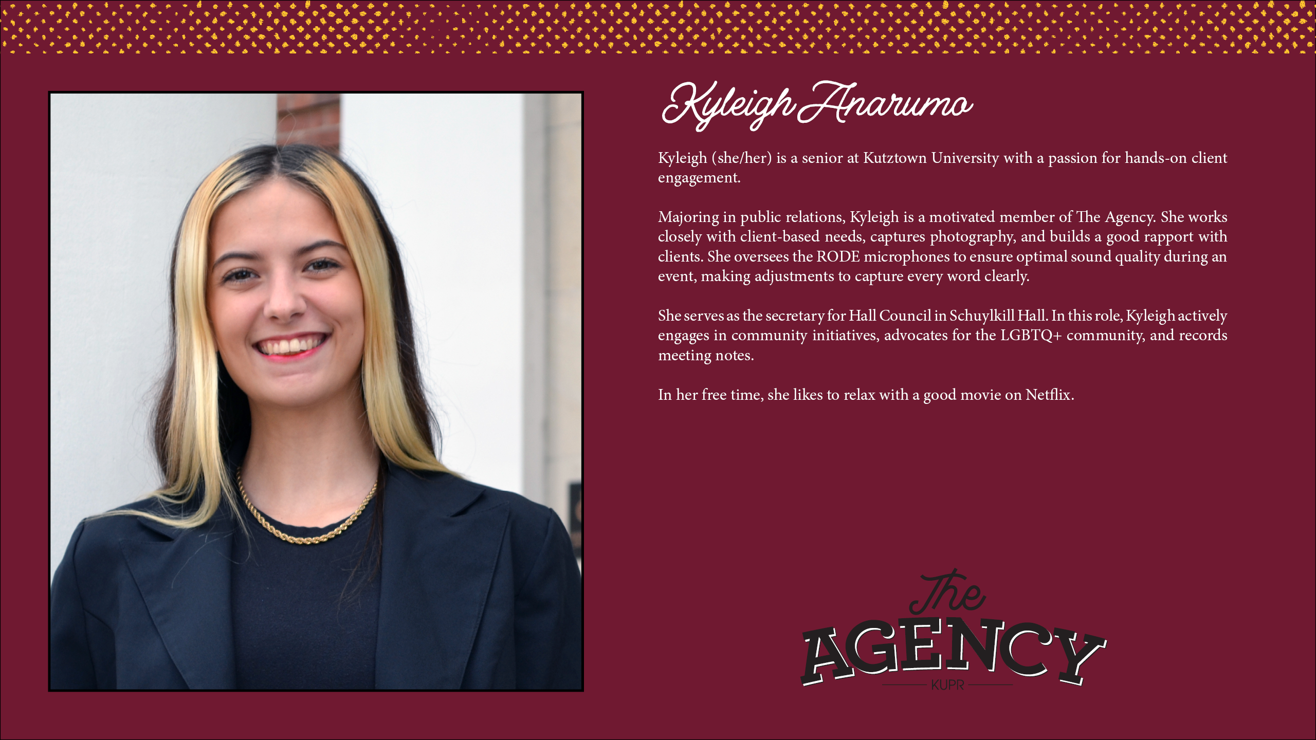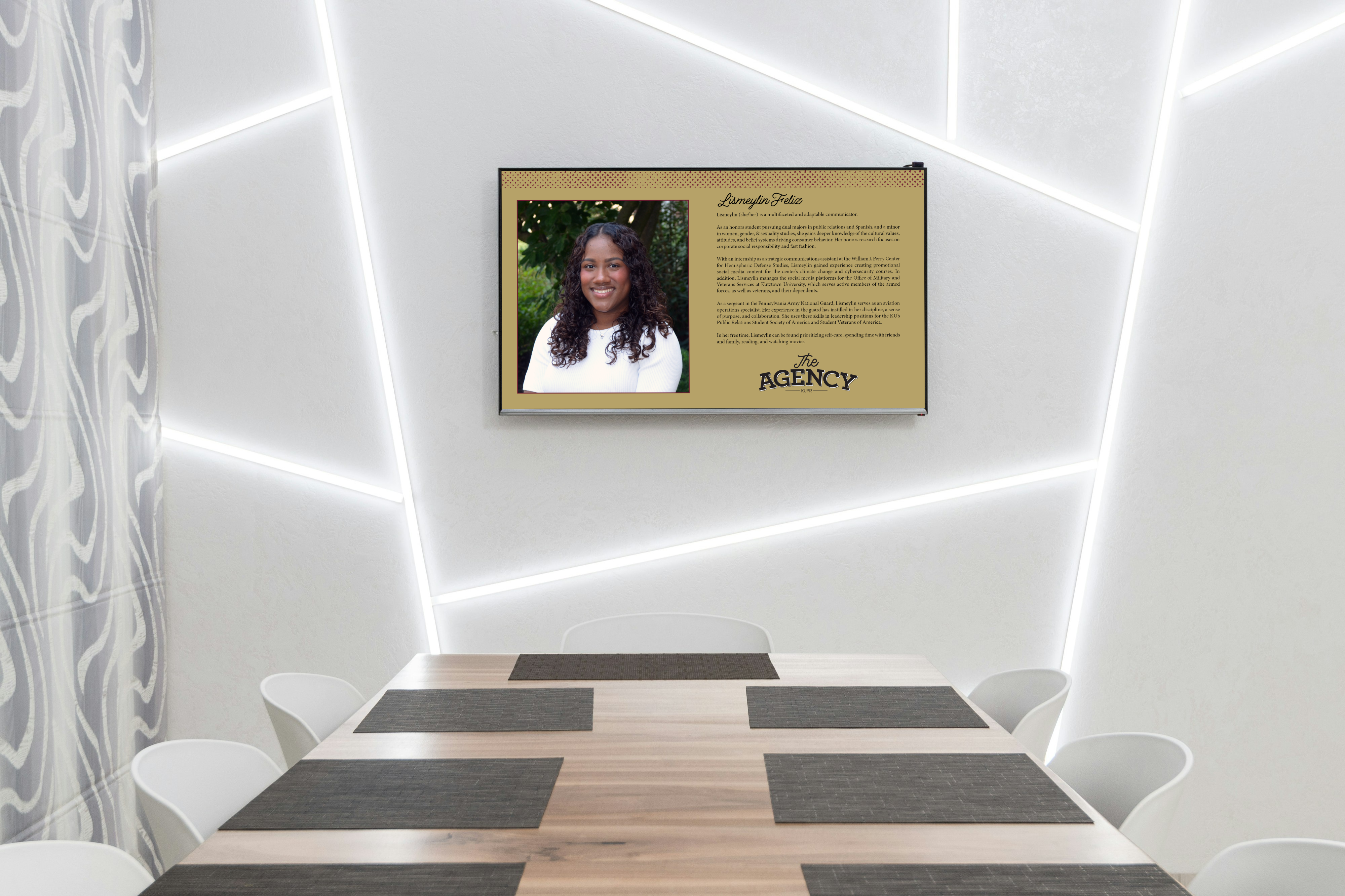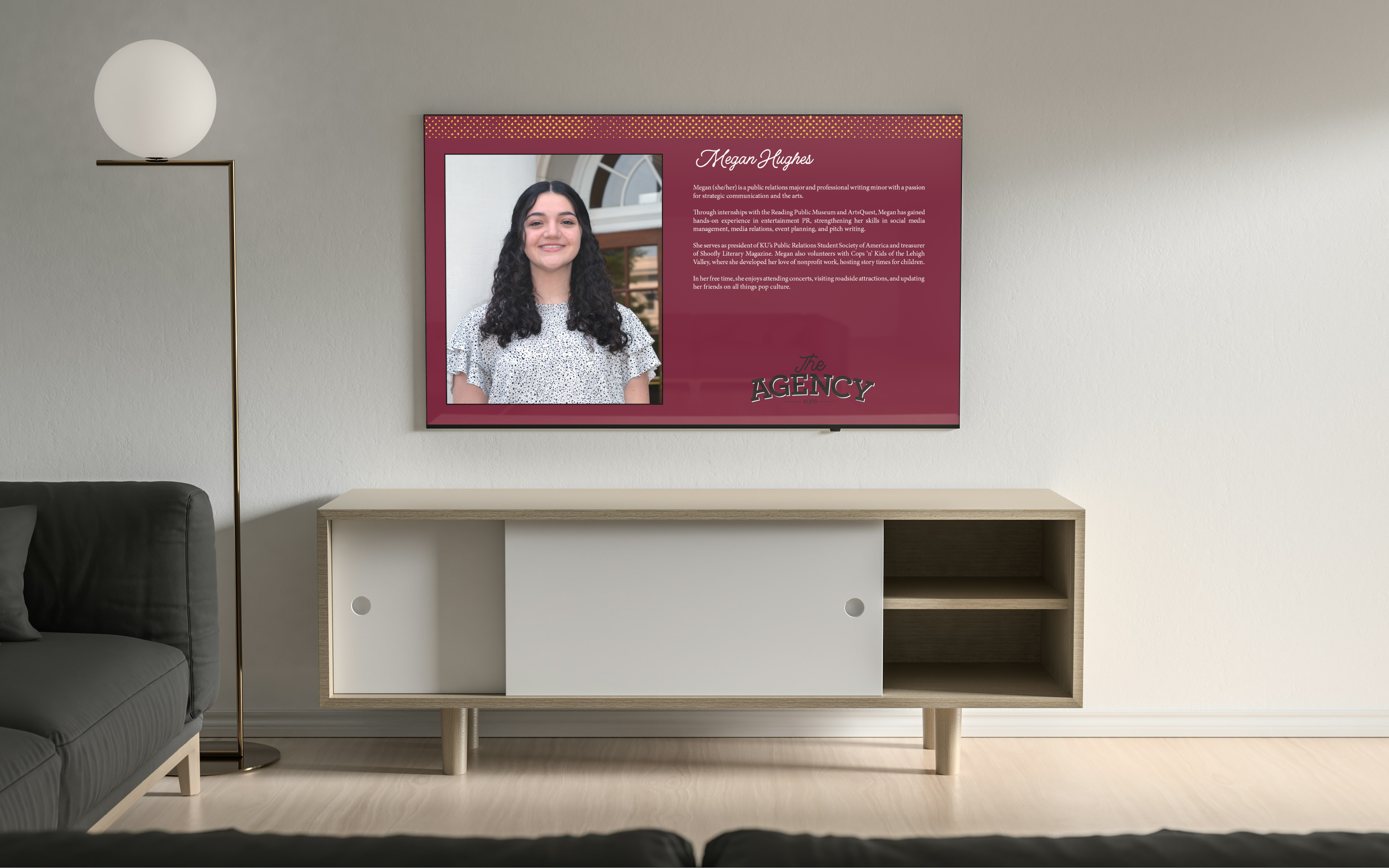 Using Kutztown University’s brand kit, I used maroon and gold elements to draw the eye towards the TV screens. I chose a cursive typeface for the names to make them appear like signatures, and then an open and simple typeface for the biography writing that would be easy to read from afar. Of course, I included the Agency’s logo to add to the branding.