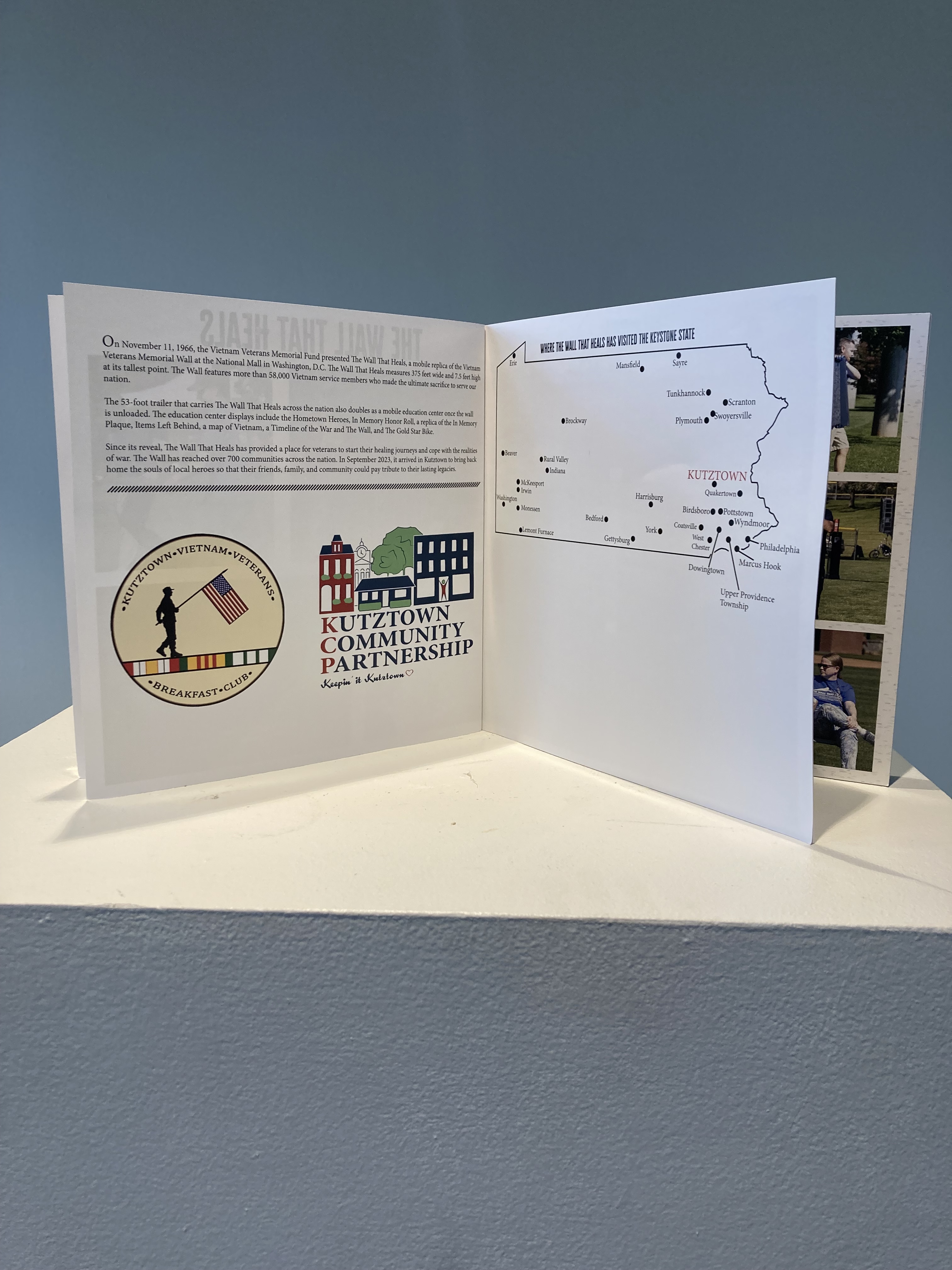In collaboration with the Kutztown Vietnam Veteran’s Breakfast Club and the Kutztown Community Partnership, I helped design a memorial book for the Wall That Heals. This picture book commemorated when the mobile replica of The Wall That Heals visited Kutztown in 2023.